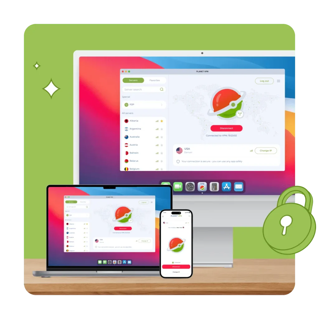 Защитите все свои устройства от онлайн-угроз с помощью Planet VPN – оставайтесь в безопасности, просматривая любимые веб-сайты, просматривая потоковое видео и скачивая торренты.